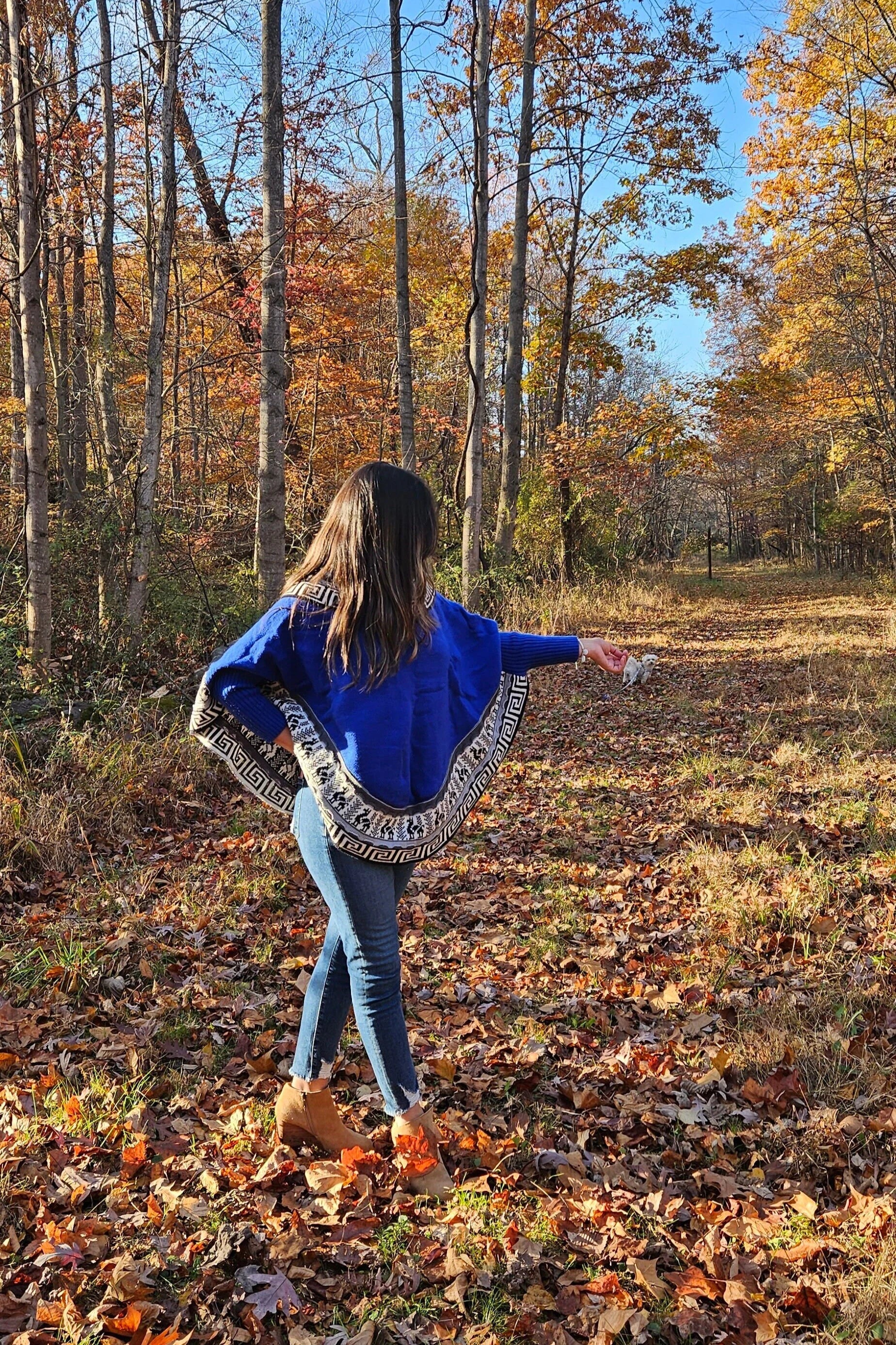 Blue knitted turtleneck poncho, alpaca poncho with long sleeves.